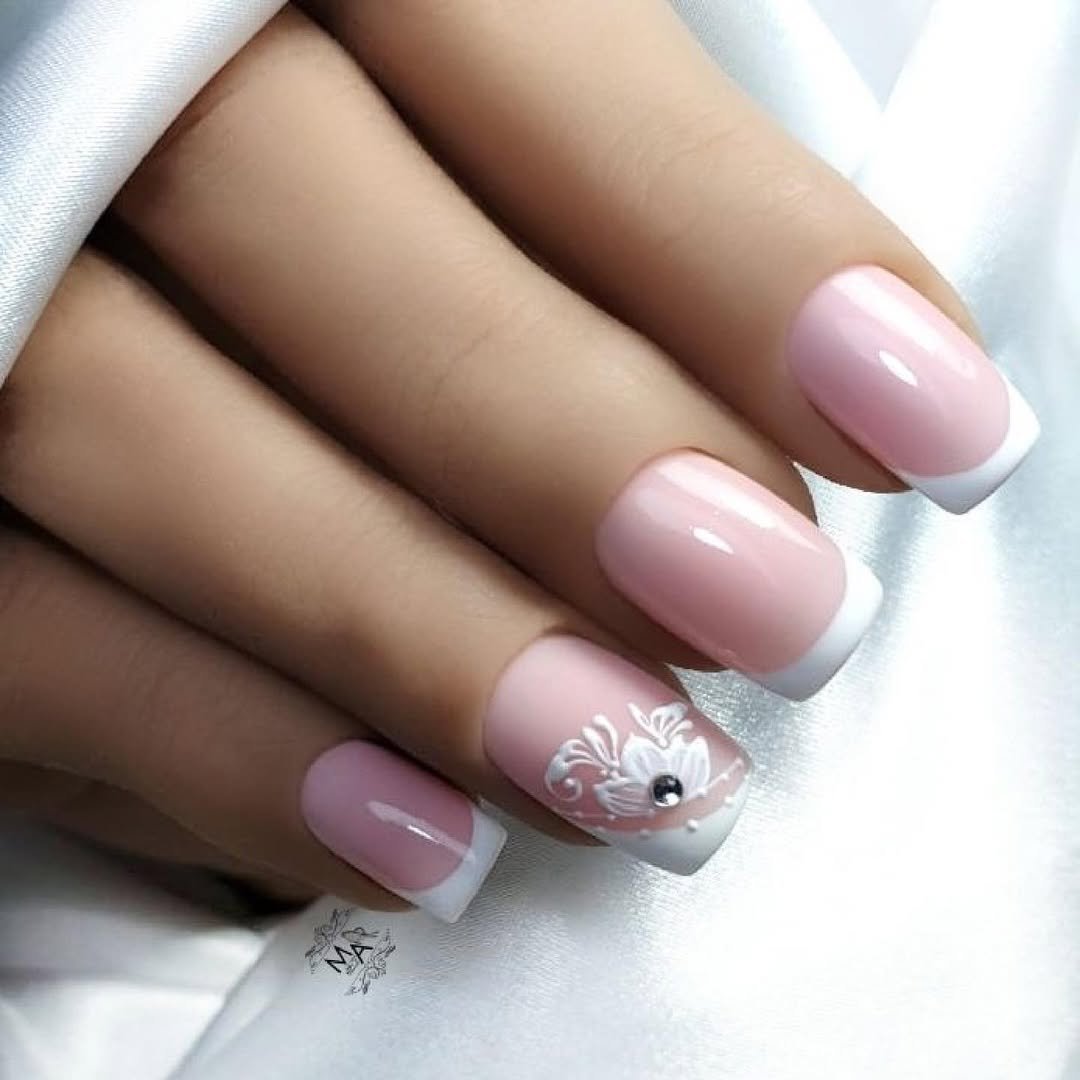 There’s something so timeless about a square French tip, and this set proves why it’s still a bridal favorite. The blushy pink base looks like it’s been kissed with light, and that single accent nail? A delicate white floral swirl with a gem at the center — like the tiniest boutonnière for your ring finger.