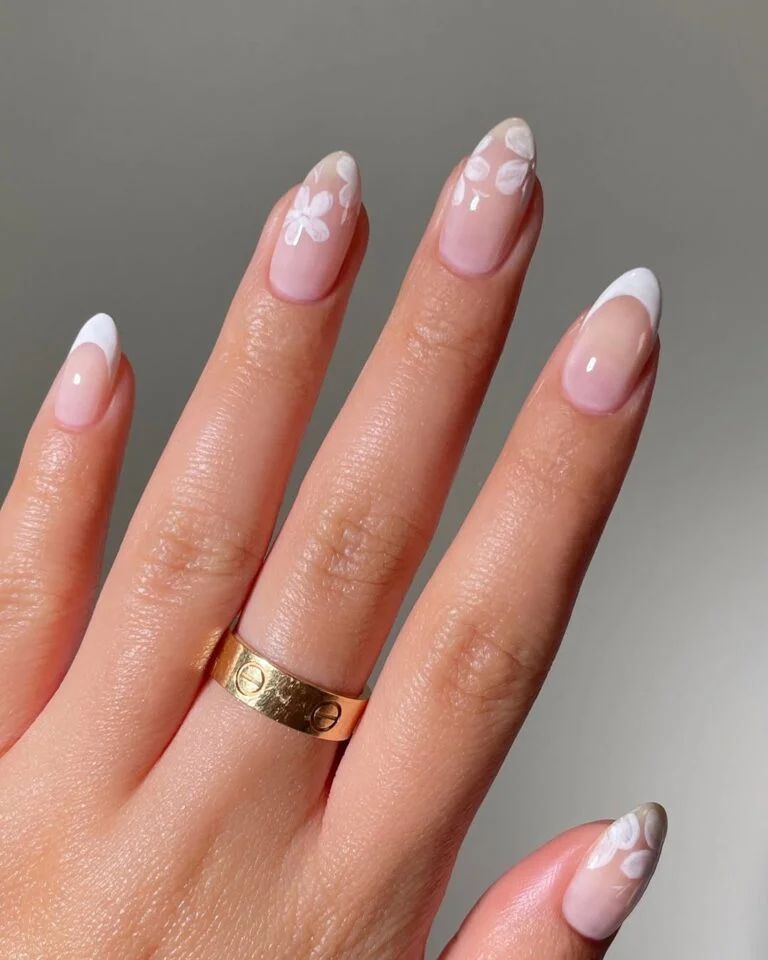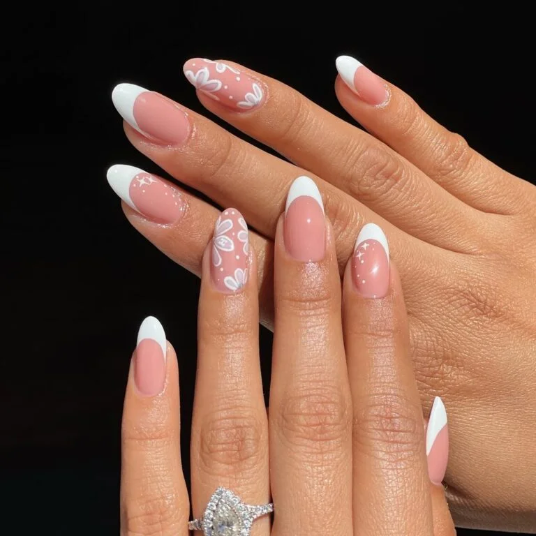 This mani gives “spring wedding in full bloom.” Classic French tips set the tone, but it’s the sweet white florals that steal the show — scattered like petals caught in a breeze. Each nail tells its own love story, effortlessly pretty but never overdone.