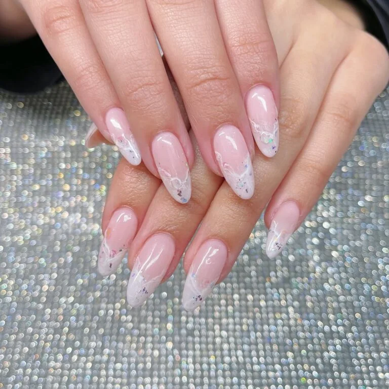 This is French tip reimagined — and it’s giving main character energy. The pinky-nude base keeps things grounded in tradition, while white marble tips, laced with subtle sparkle, bring in an ethereal twist. It’s modern bridal elegance with a whisper of fantasy.