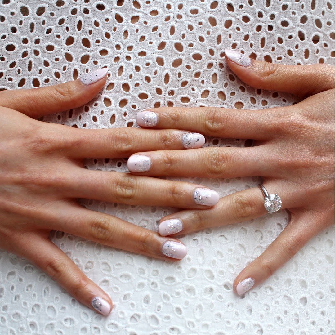 Short, sweet, and speckled with fairy dust — these soft pink nails with silver glitter are what happens when classic meets playful. They feel bridal without being fussy, the kind of mani you could wear from the ceremony to the honeymoon.