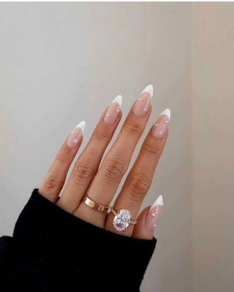 These sculpted almond nails are bridal to their core — crisp white tips floating over a sheer nude base like silk ribbons. Each nail is so perfectly shaped it almost feels unreal, like they were custom-designed for showing off that ring (which, let’s be honest, they were).