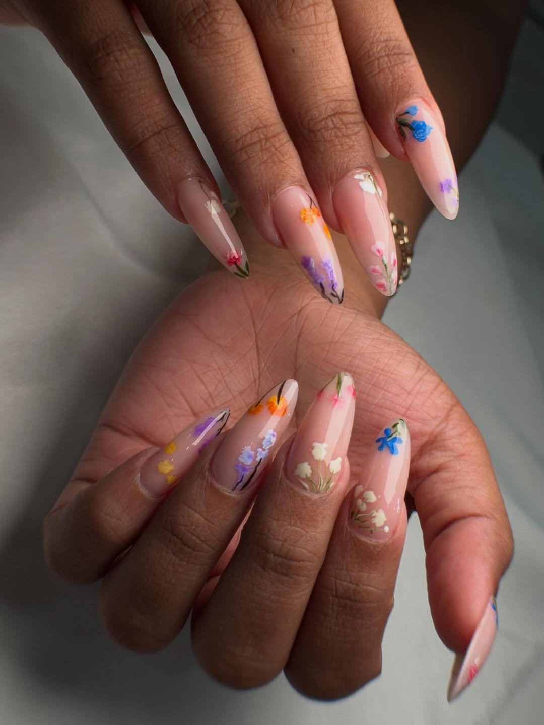 These nails feel like a meadow in miniature. Long, tapered shapes with soft nude bases are dotted with tiny wildflowers in pastel tones that stretch across each fingertip.