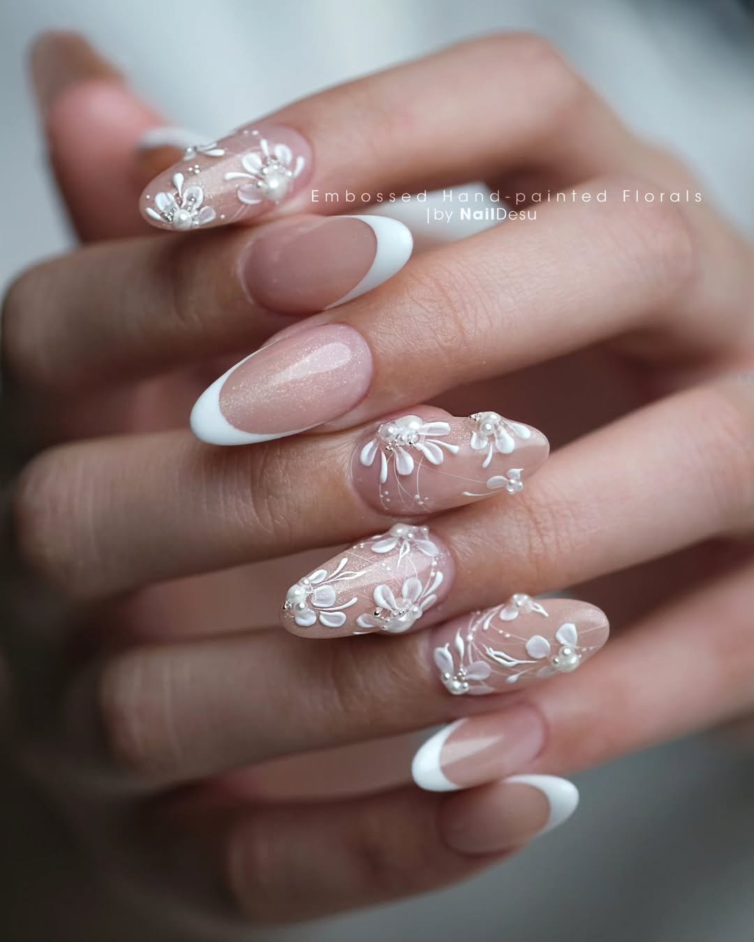 This set feels like lace pressed into porcelain. The soft blush base paired with crisp white French tips already leans timeless, but it’s the raised floral detailing that turns it into something unforgettable.