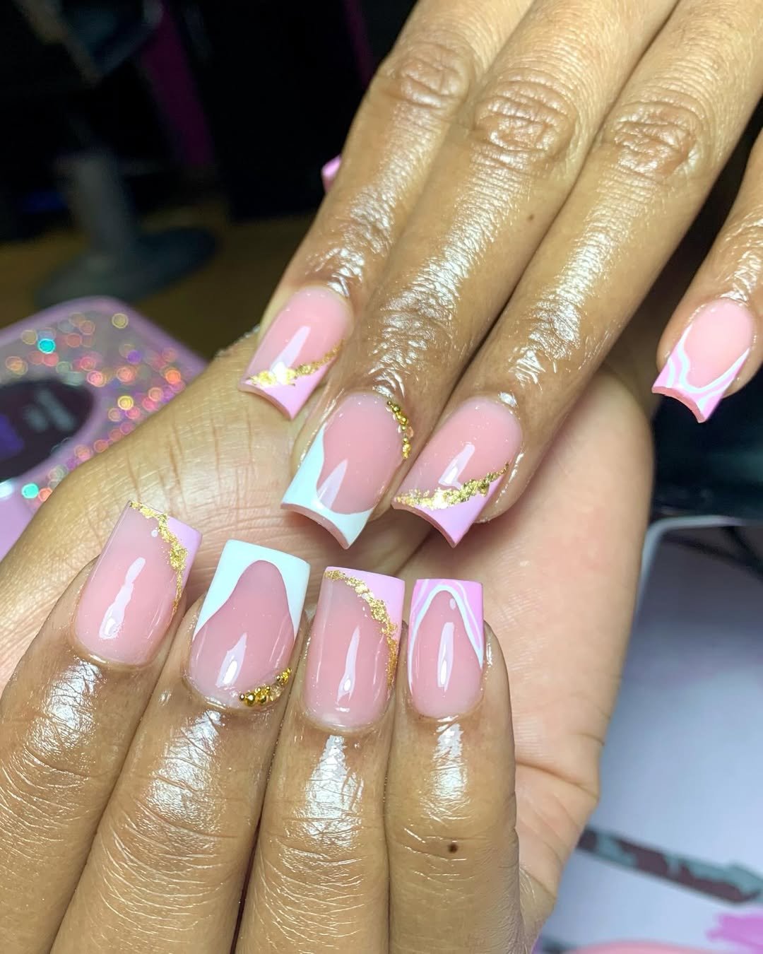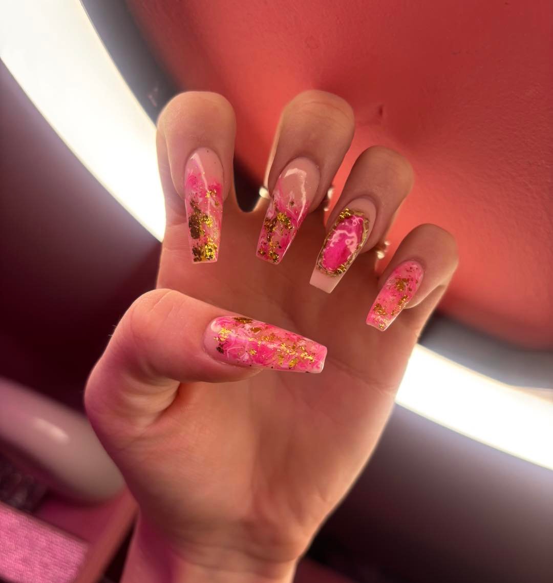 These nails feel like little pieces of art. Swirls of pink layered with delicate gold leaf create a marbled effect that feels both luxe and feminine.