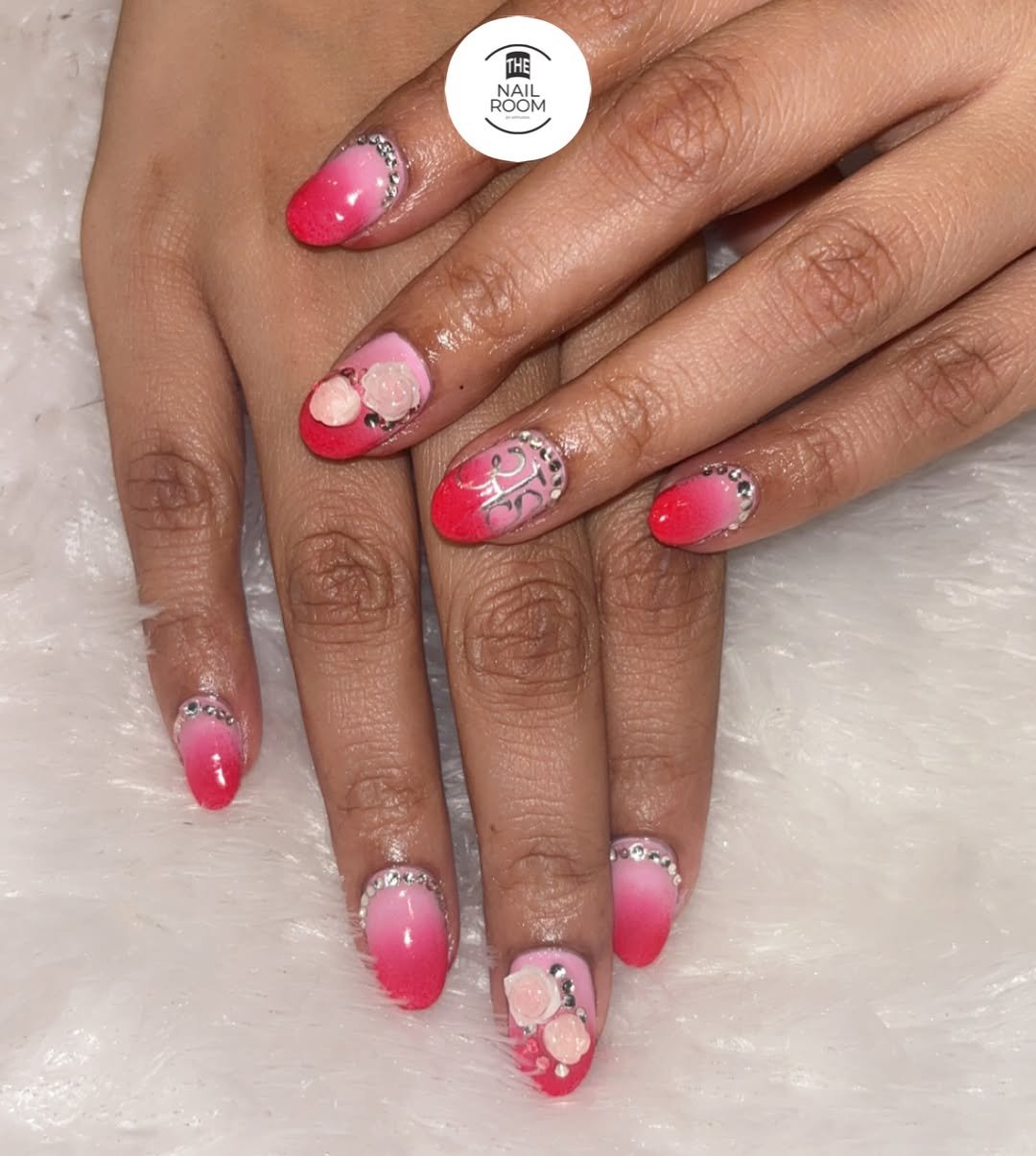 A bold pink fade takes center stage here, fading from soft blush into a vibrant coral tip that instantly lifts the mood. The rhinestone accents trace the cuticle like jewelry, catching light with every movement.