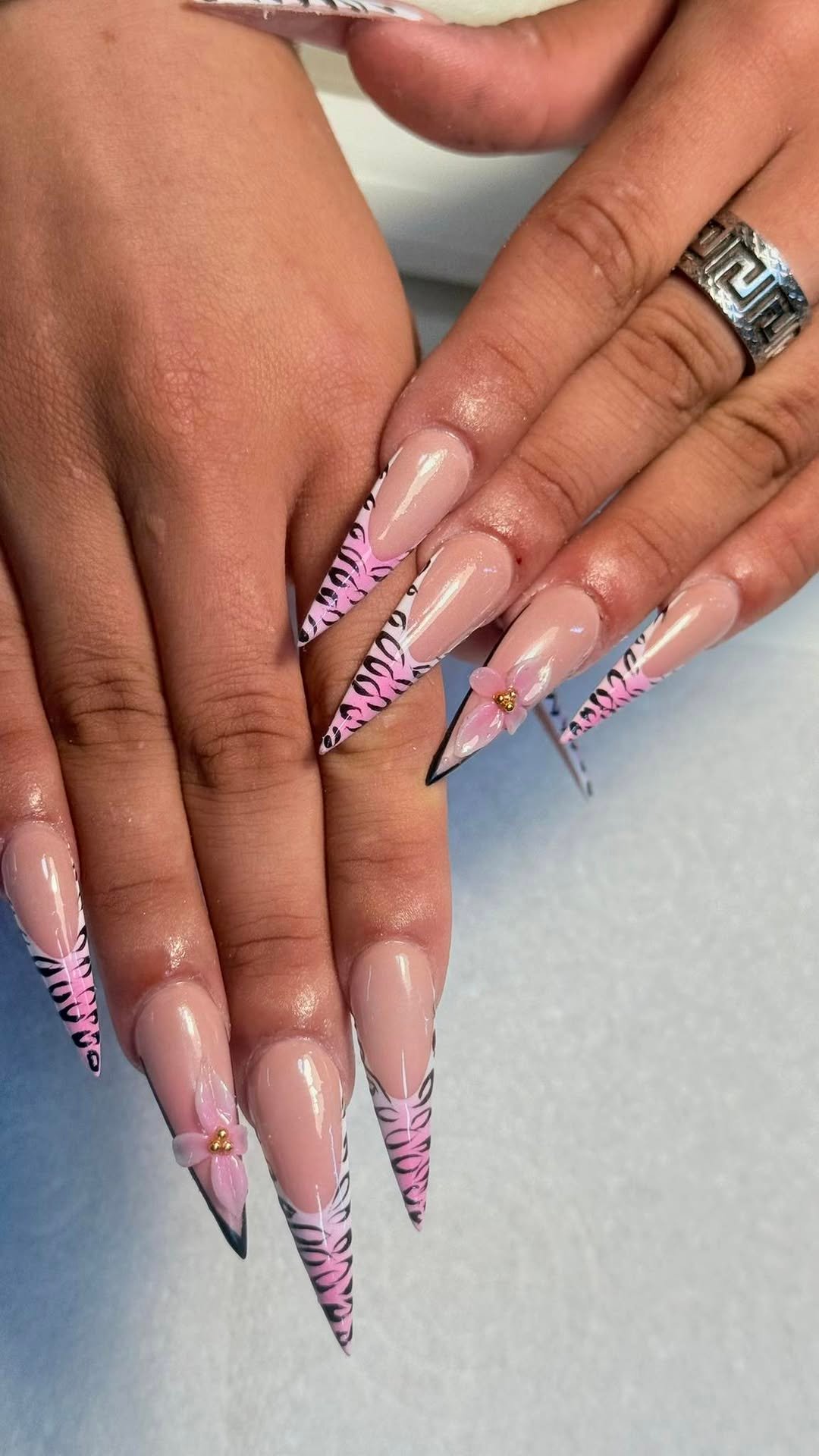 These stiletto nails bring a little attitude to the mix. A glossy nude base meets pink zebra tips and a single sculpted flower detail that pulls everything together.