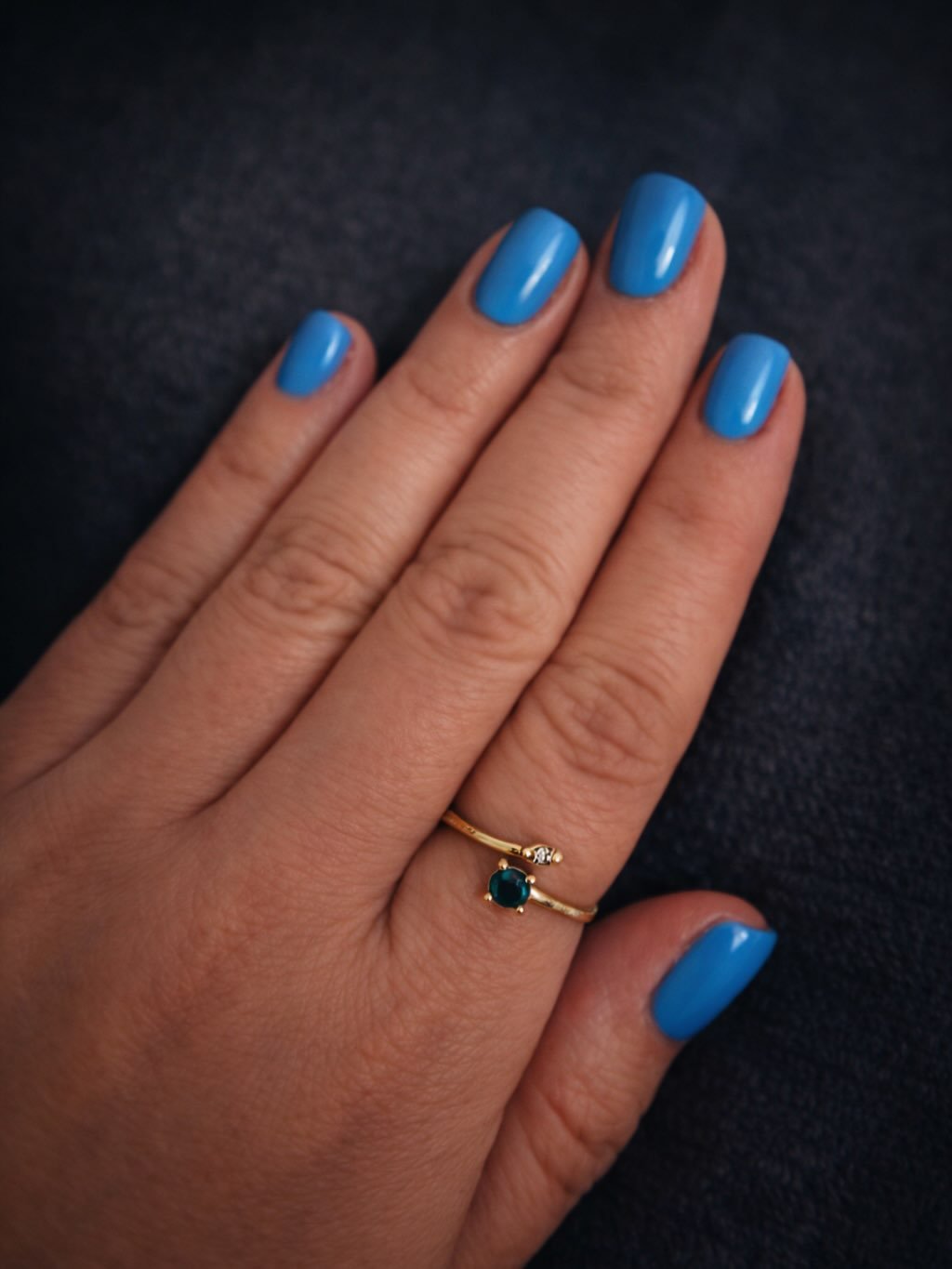 This is quiet luxury in nail form. A creamy powder blue, short and glossy, paired with a delicate gold ring, it’s effortlessly put together without trying too hard.