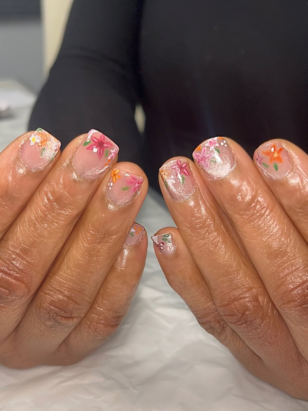 There’s a playful energy here that feels like spring in full bloom. Soft pinks layered with hand-painted leaves and petals give each nail its own little moment.