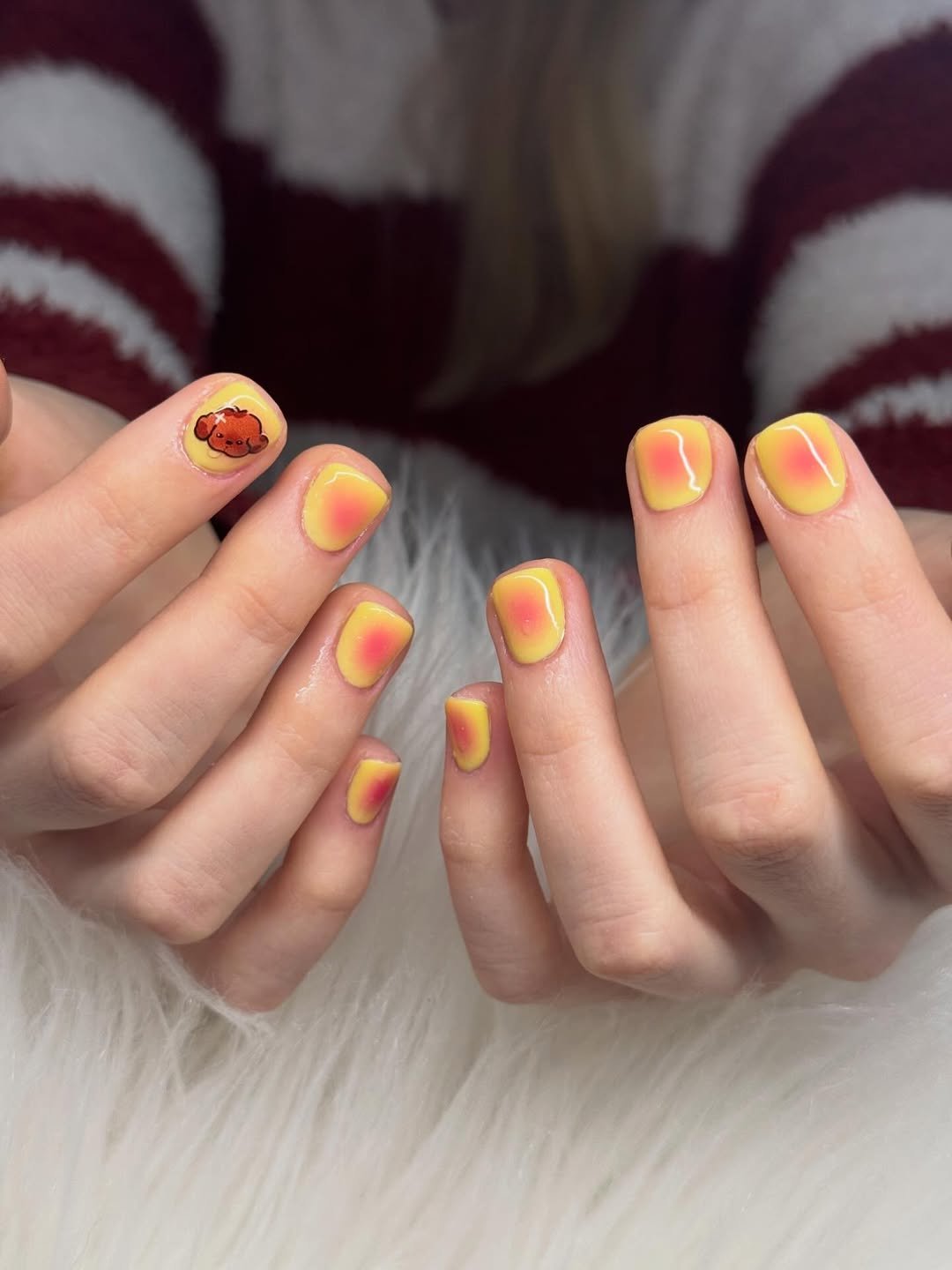 Short nails, but full of personality. The warm yellow base with soft coral centers gives that glowing, sunset-inspired effect that feels fresh and cheerful.