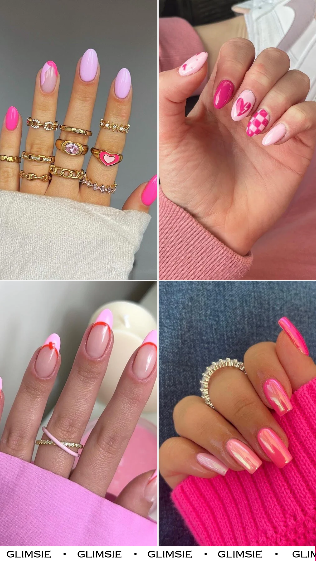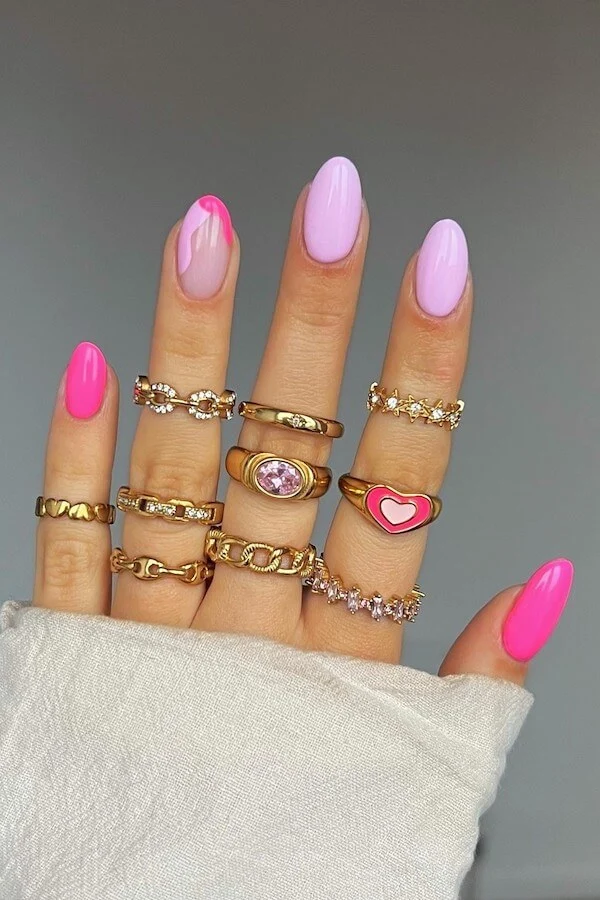 Vibrant pink meets romantic waves in this bold, ultra-fun Valentine look. The glossy mix of hot pink and lavender gives off pure dopamine energy, amplified beautifully by the gold jewel stacked rings.