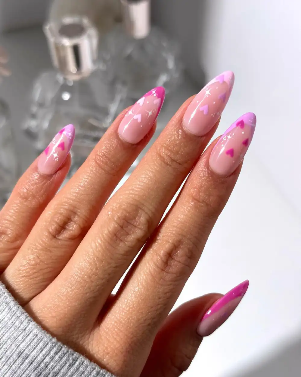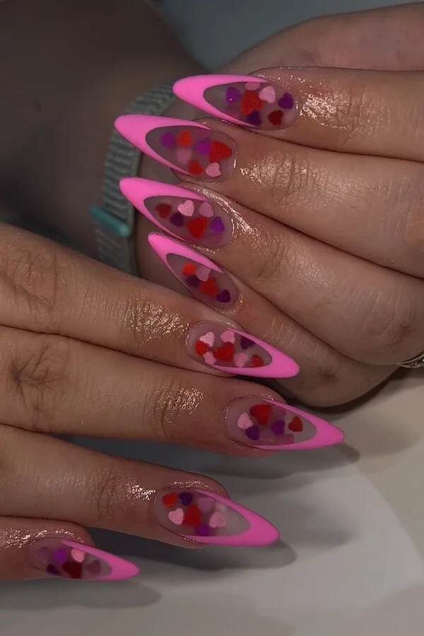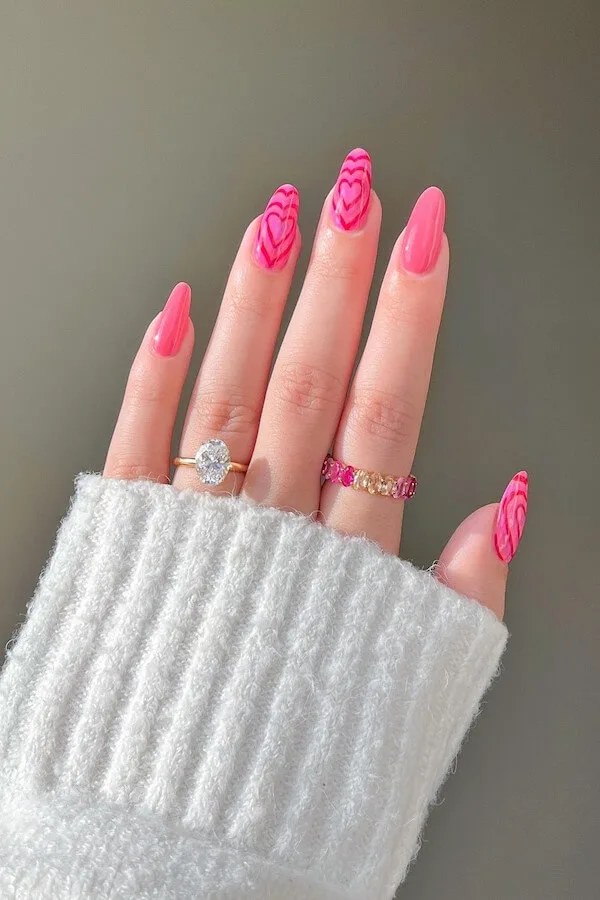 These nails are pure Valentine confidence — bold pink, sharp almond tips, and those perfectly layered heart waves that look like they’re pulsing with energy. They practically glow in sunlight, catching attention in the best way.