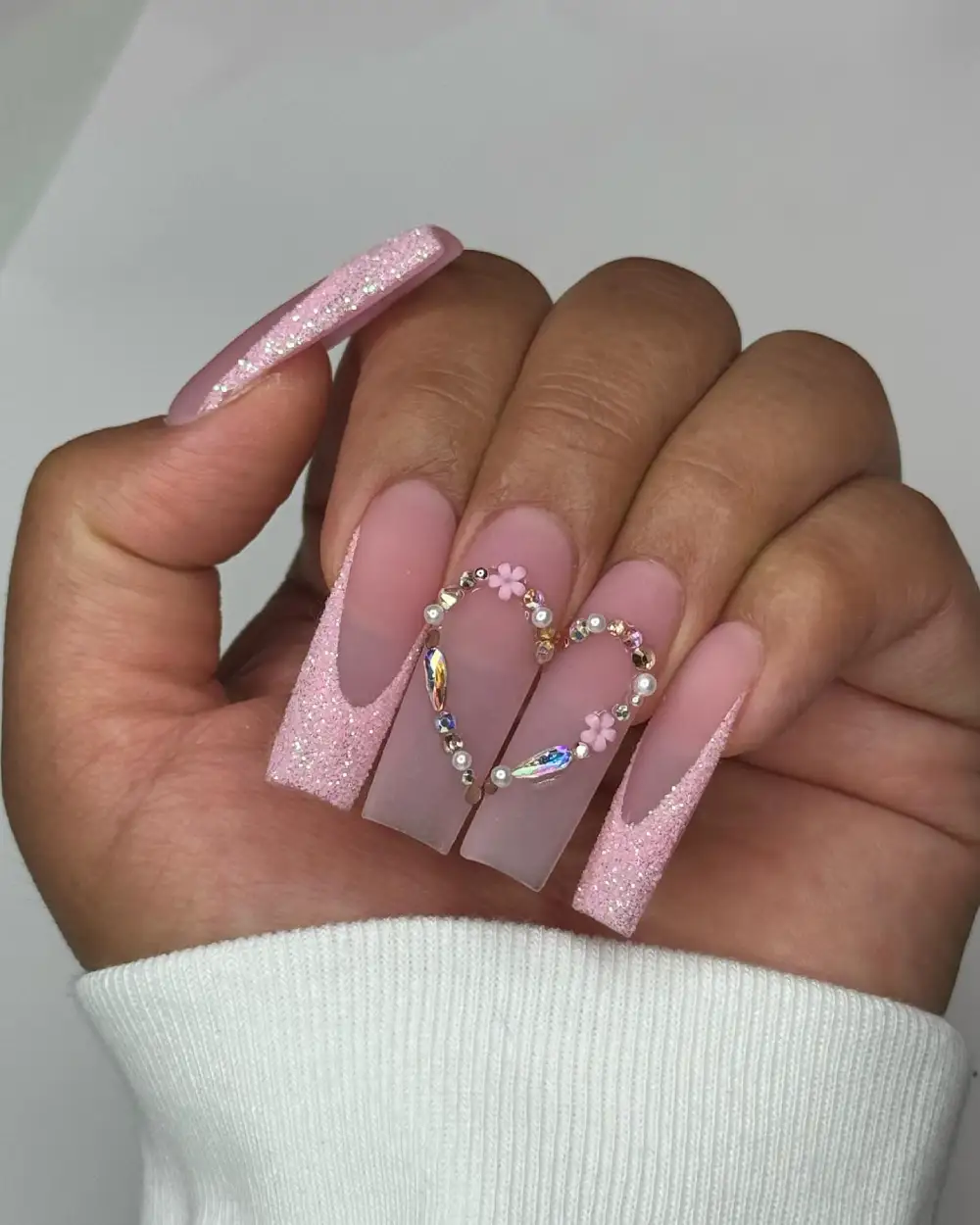 This long sculpted set leans into sparkle in the most elegant way — glittery pink sides shaping into a rhinestone-lined heart across two nails. It’s dramatic, but there’s a softness in the sheer blush base that keeps everything chic rather than overwhelming.