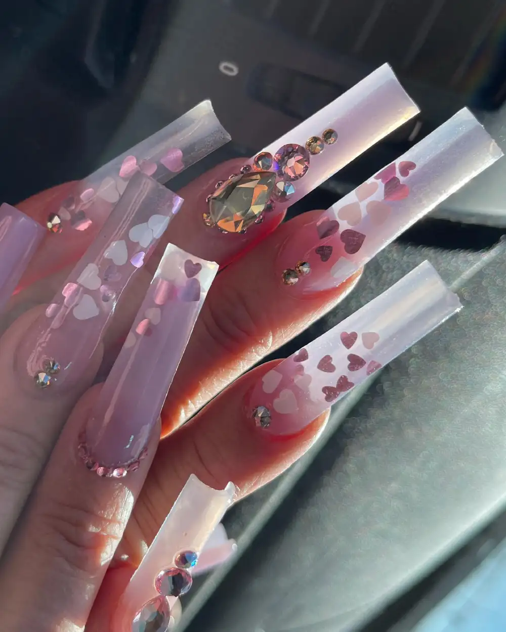 This extra-long, sculpted set is a full glam moment — sparkling hearts suspended in jelly-pink tips, paired with oversized crystals that catch every glimmer of light. It’s bold, dramatic, and dripping in Valentine’s luxury.