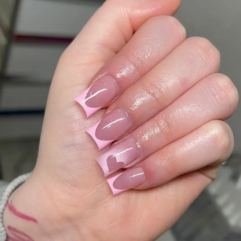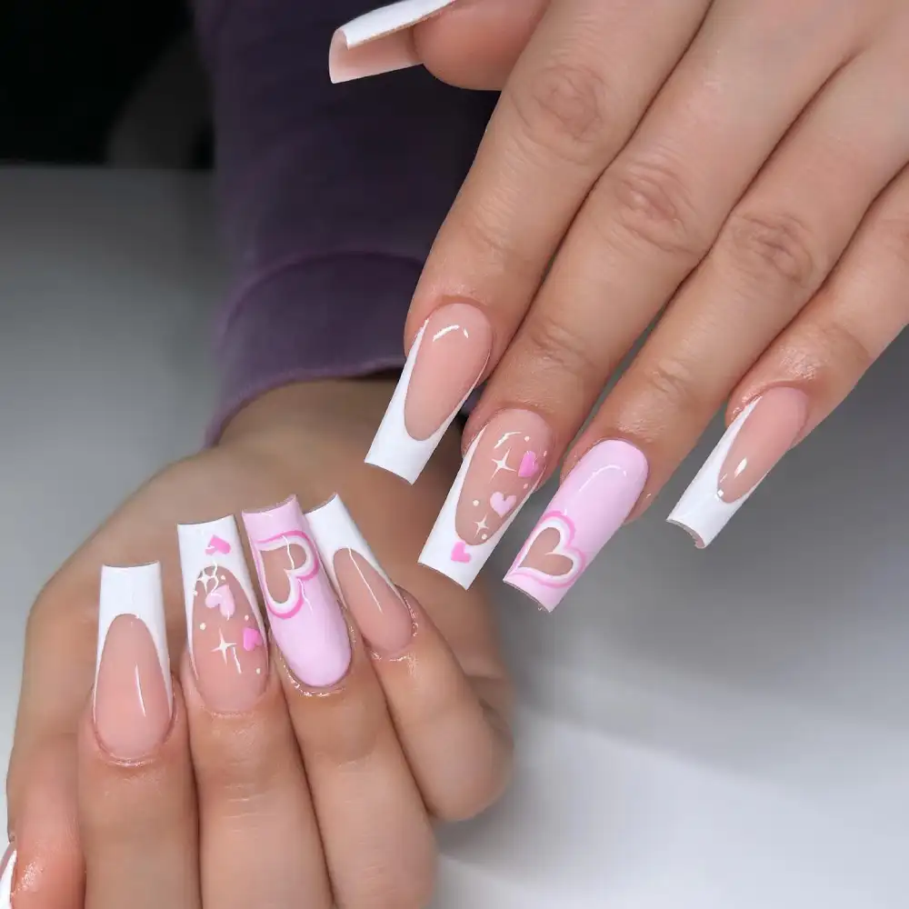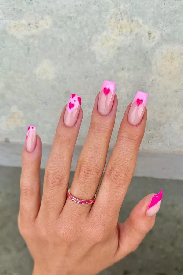 These crisp square tips with bubblegum-pink accents and bold hearts feel charmingly retro — almost like a love-themed candy box in nail form. The clean nude base keeps everything polished and modern.