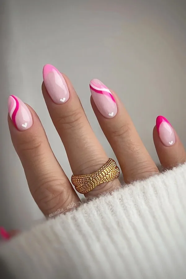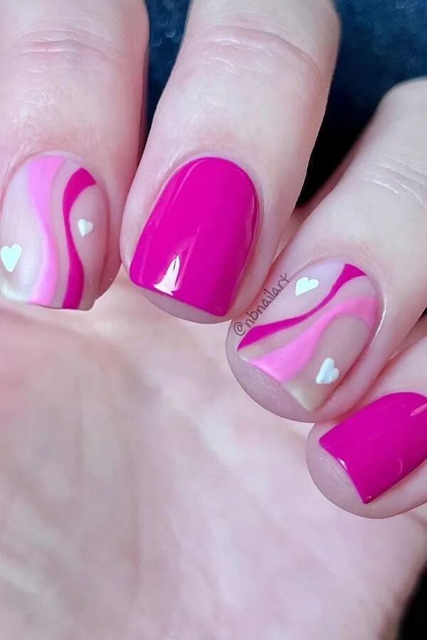 This set blends soft blush bases with swooping hot-pink waves, creating a look that’s both elegant and lively. The tiny white hearts give it just the right hint of Valentine’s sweetness without overwhelming the sophisticated shape.