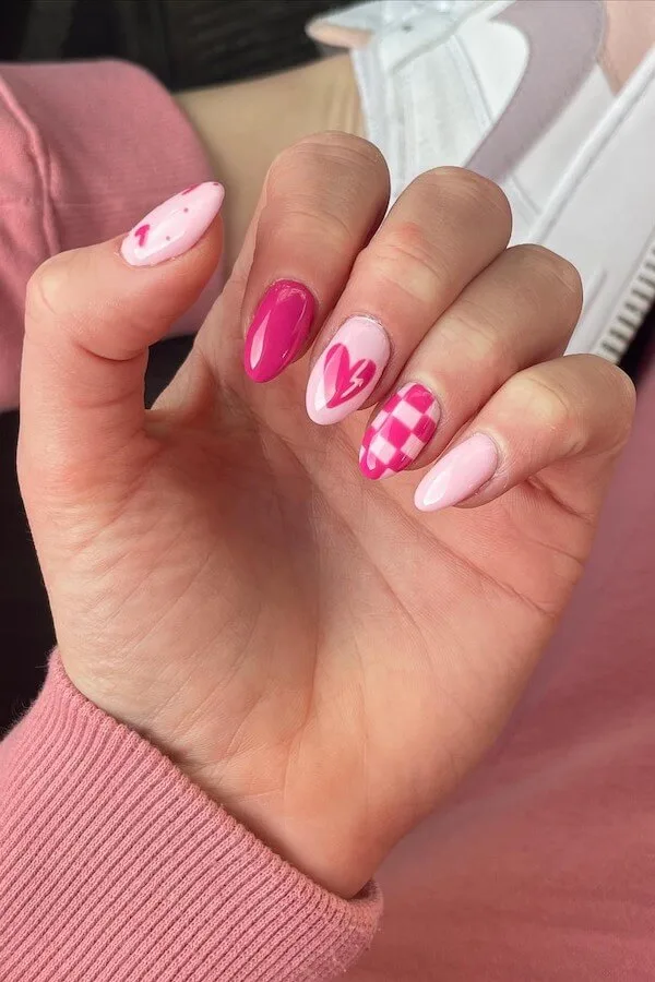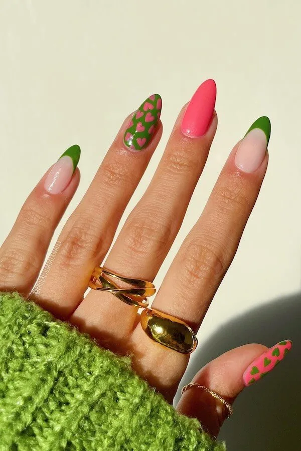Green and pink shouldn’t work this well together, yet here they do — creating a fresh, quirky Valentine palette. The tiny green hearts scattered across the pink nail are unexpectedly adorable, giving the whole set a “springtime crush” kind of energy.