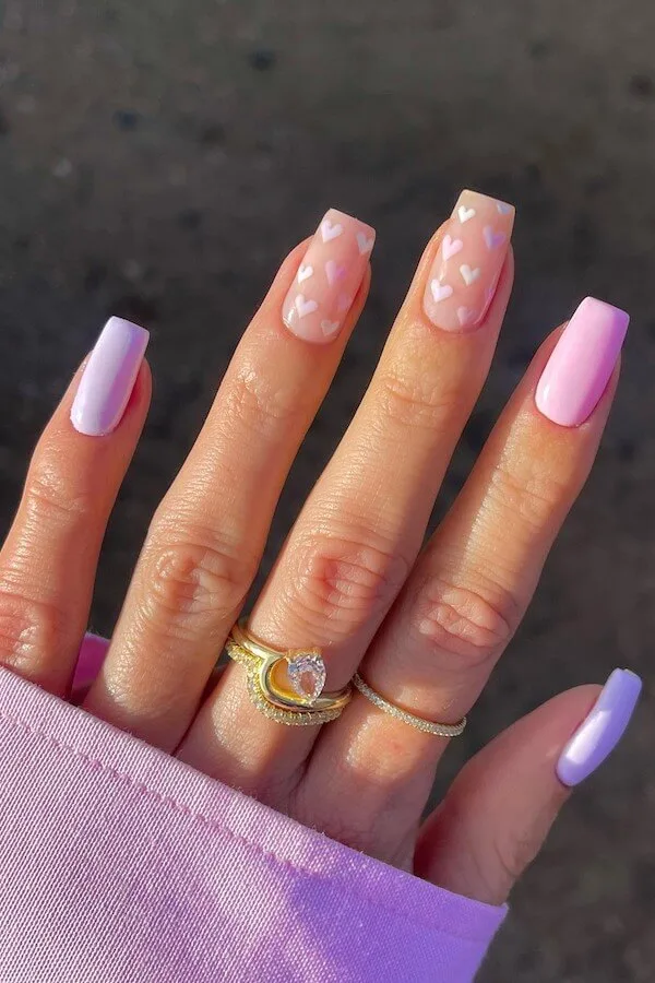 A pretty blend of lilac and petal pink, with tiny white hearts floating across the middle nails — soft, girly perfection. The squared shape keeps everything crisp, while the pastel tones make the whole set feel light and happy.