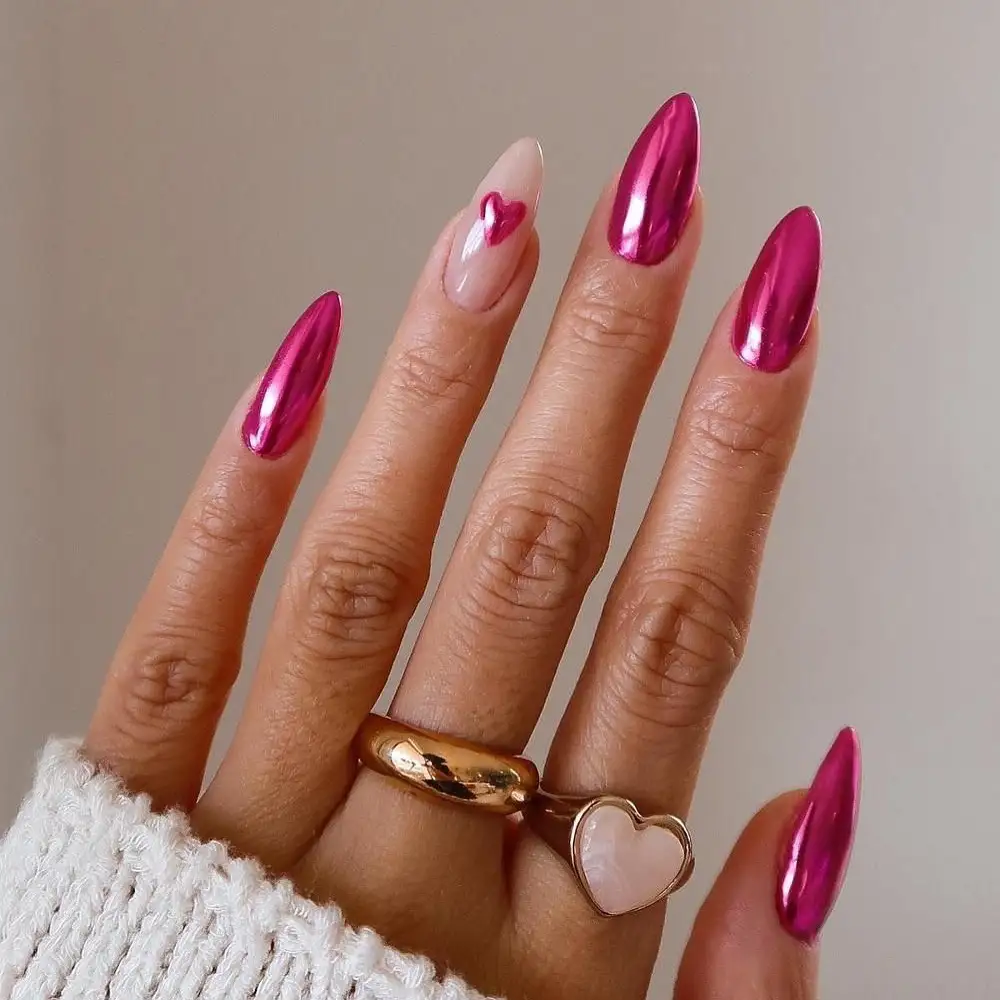 A chrome-pink almond set that gleams like liquid metal? Yes, please. Paired with one soft nude accent nail topped with a single rosy heart, the whole look becomes sweet and striking all at once.
