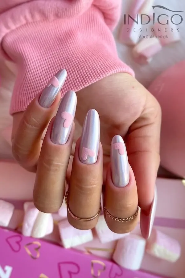 Luminous pearl polish creates a soft, light-catching base, and the pastel hearts add a delicate touch of charm. These nails feel like Valentine’s Day seen through a glossy, pastel filter — sweet, feminine, and impossibly pretty.