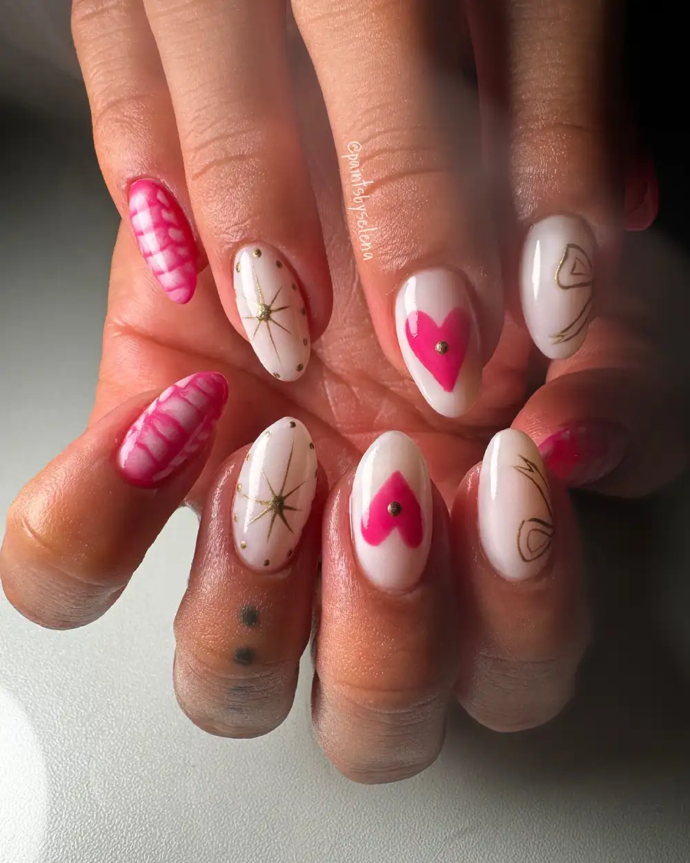 This set feels like a little collage of Valentine favorites — doodled hearts, gold accents, painterly strokes, and soft white bases. Each nail feels unique, yet everything ties together through that bright pop of pink.