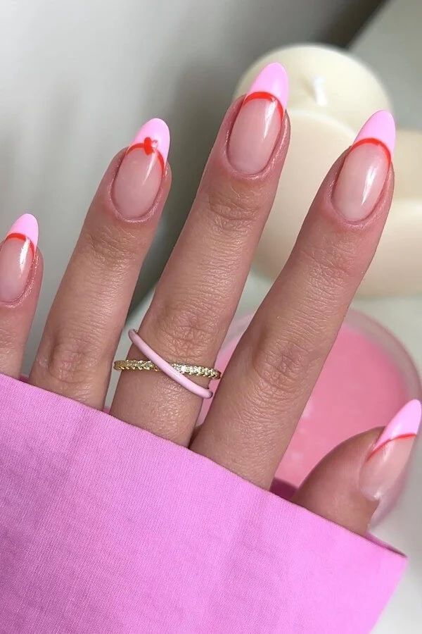 A clean, minimalist French gets a romantic twist here — baby-pink tips outlined with a pop of bright red. It’s subtle yet striking, like a classic design that suddenly feels fresh and modern.