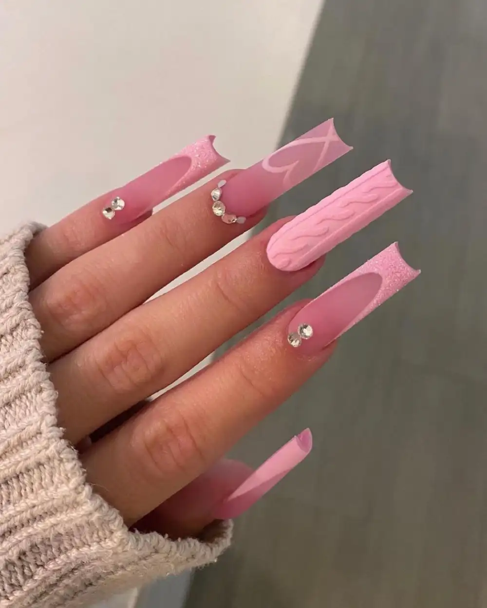 There’s something instantly enchanting about this long, sculpted pink set. The combination of velvety matte details, cozy cable-knit texture, and those tiny arcs of crystal makes the whole look feel like Valentine’s Day wrapped in your favorite sweater. It’s playful, but in that elevated, “I put effort in, but effortlessly” way.
