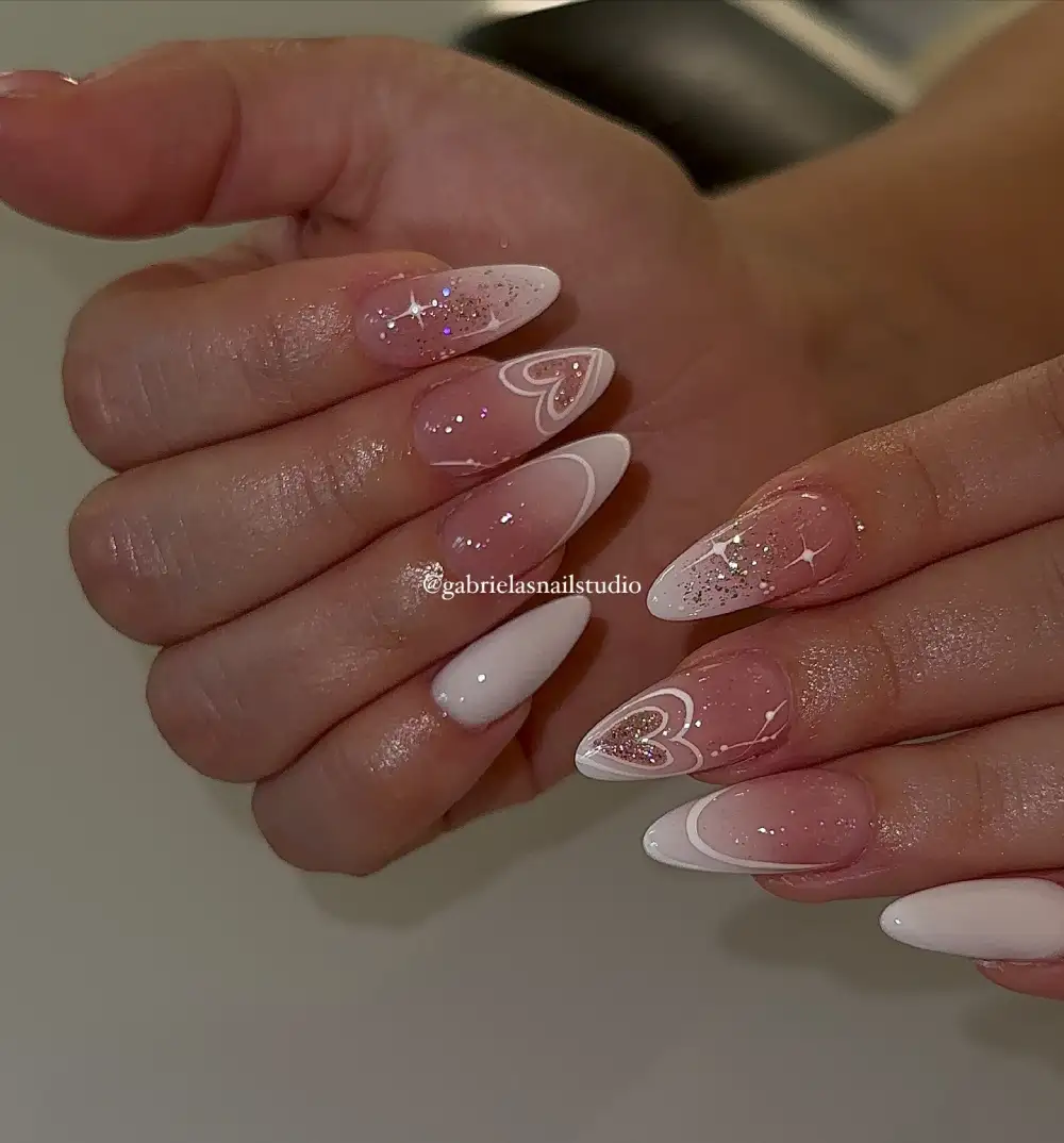This dreamy, ethereal set blends pearly whites, tiny sparkle flecks, and layered heart outlines for a look that feels like a fairy-tale Valentine. The long almond shape adds elegance, balancing the sweetness of the design.