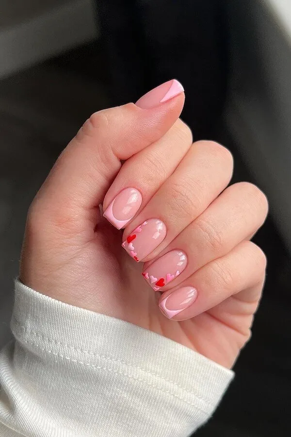 This short, glossy blush pink set delivers all the Valentine charm without going over the top. The scattered red and pink hearts add just enough flirtiness, while the soft swirl French accents tie everything together with a modern twist.