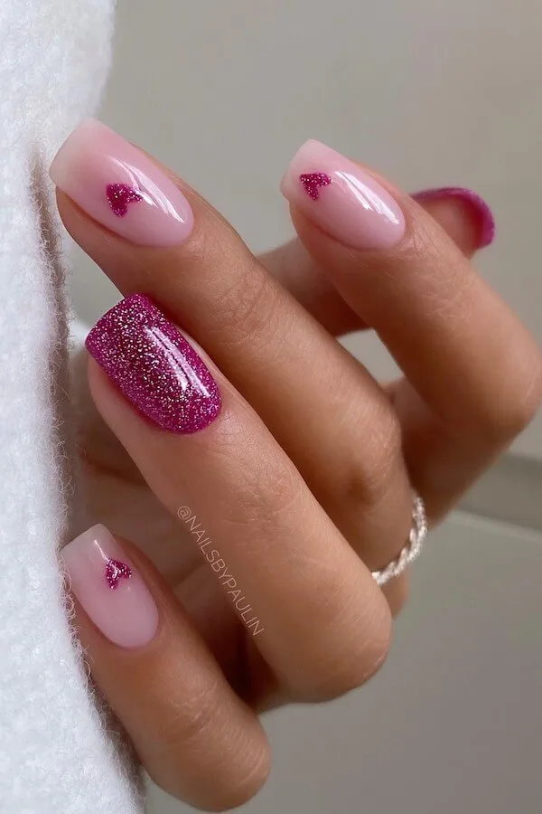 Minimalist hearts meet full-on glitter glam in this dreamy, pink-toned set. The delicate heart accents are subtle enough for everyday wear, but that sugar-sparkle nail brings just the right amount of festive drama.