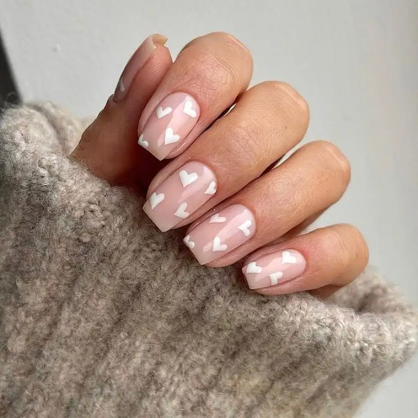 Soft neutral-pink nails sprinkled with tiny white hearts — this set is effortlessly sweet and beautifully clean. It’s simple, but there’s a quiet charm to the way the hearts float across each nail like little love notes.