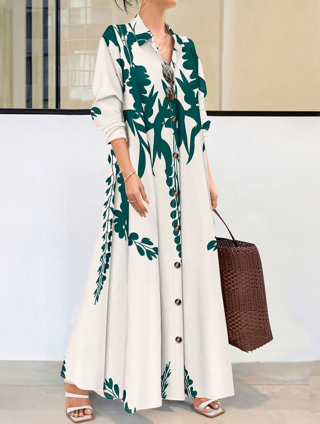 This maxi brings statement print and modest elegance together seamlessly. The sweeping silhouette and graphic green pattern feel fresh and confident, while the button-front detail keeps it structured.