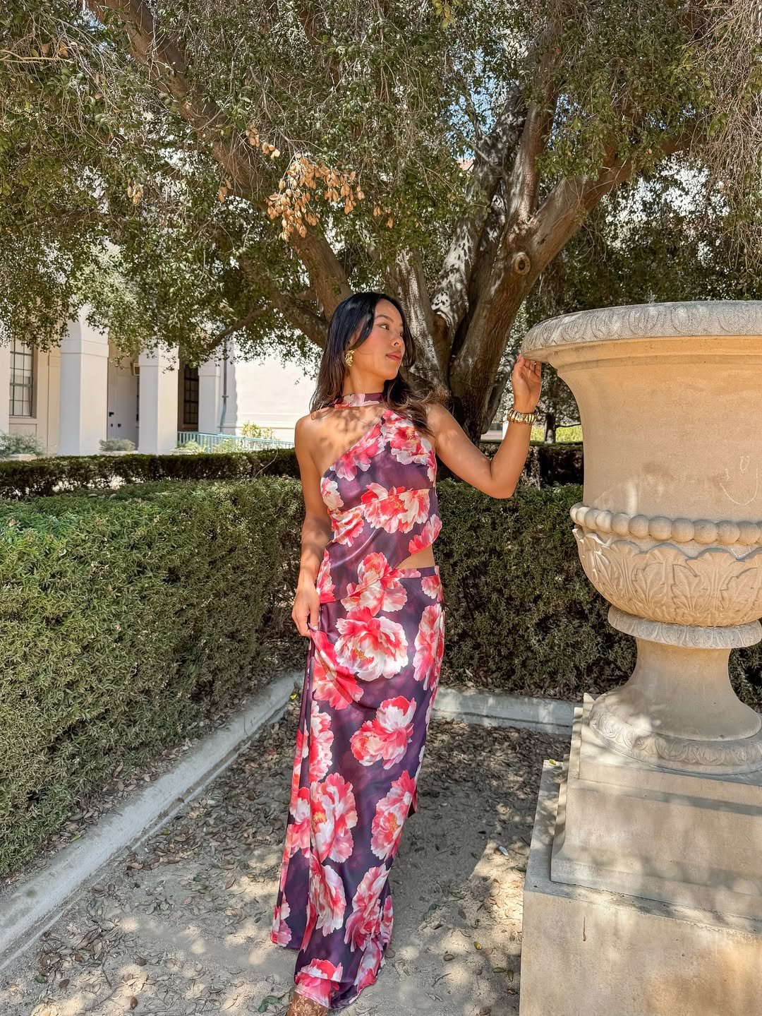 This floral cutout maxi is not here to blend in. The rich tones and statement print feel elevated, while the asymmetrical neckline adds just the right edge.