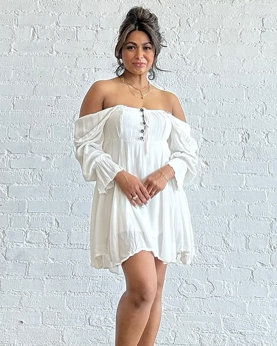 An off-the-shoulder white mini in spring just makes sense. The soft fabric and relaxed shape keep it comfortable, but the neckline adds that subtle “oh, this?” charm.