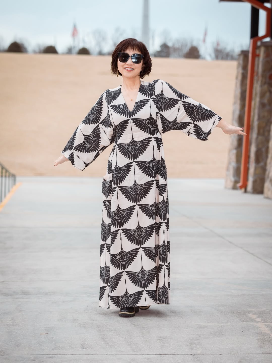 This black-and-white crane print maxi makes a statement without relying on color. The flowy sleeves and deep V neckline bring movement and ease to the bold pattern.