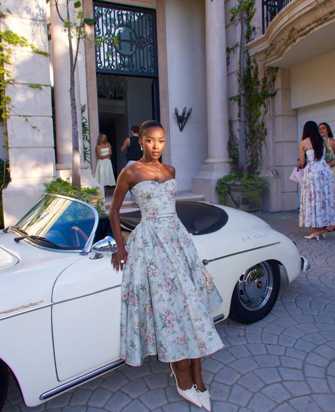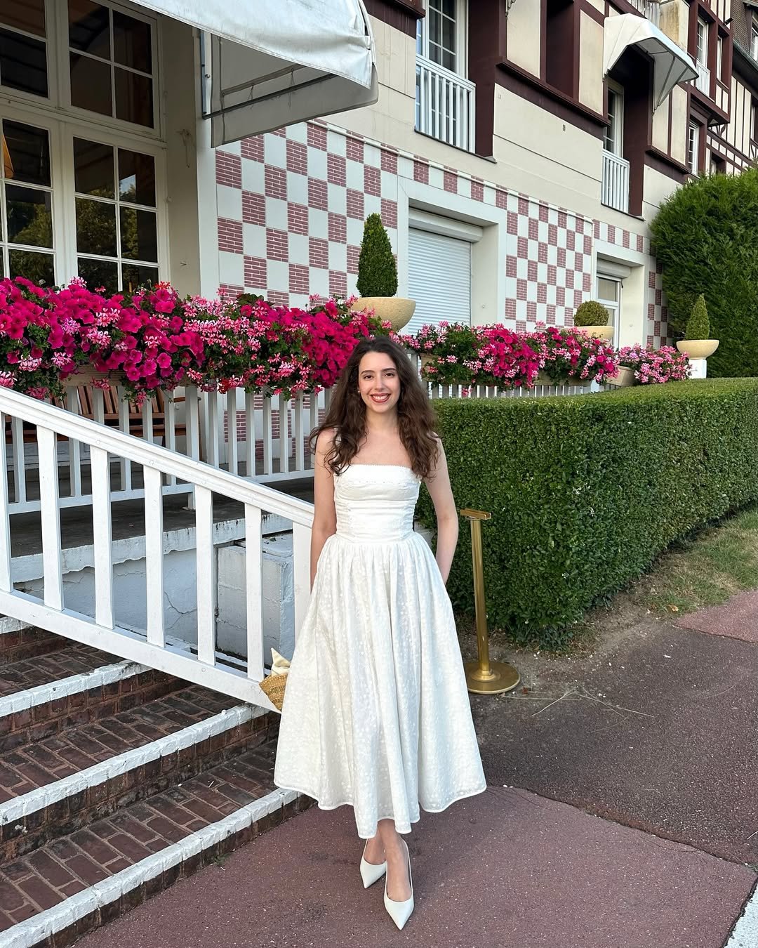 A strapless white midi framed by blooming pink florals feels straight out of a European postcard. The fitted bodice and full skirt create that timeless silhouette that never needs explaining.