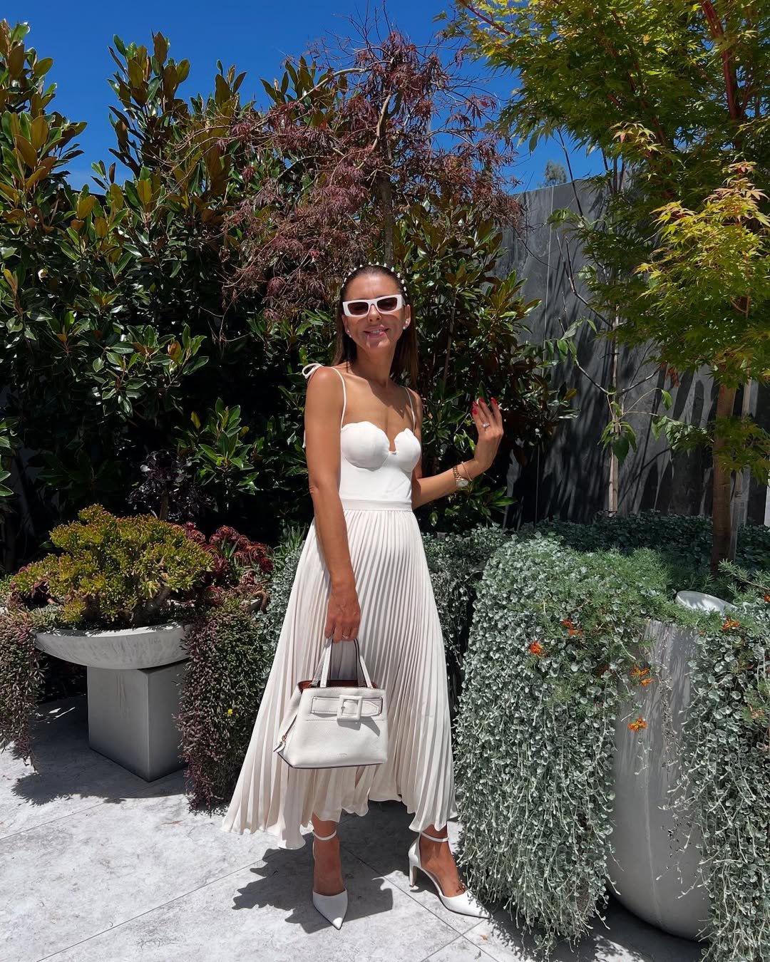 Styled with pointed white heels and a structured mini bag, it leans into quiet luxury without being fussy. It’s giving summer celebration energy, the kind that calls for champagne and oversized sunglasses.
