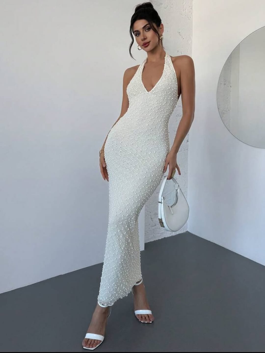 This halter-style ivory dress is all about shape. The textured fabric hugs in the right places, flaring gently at the hem for a silhouette that feels confident and bold.