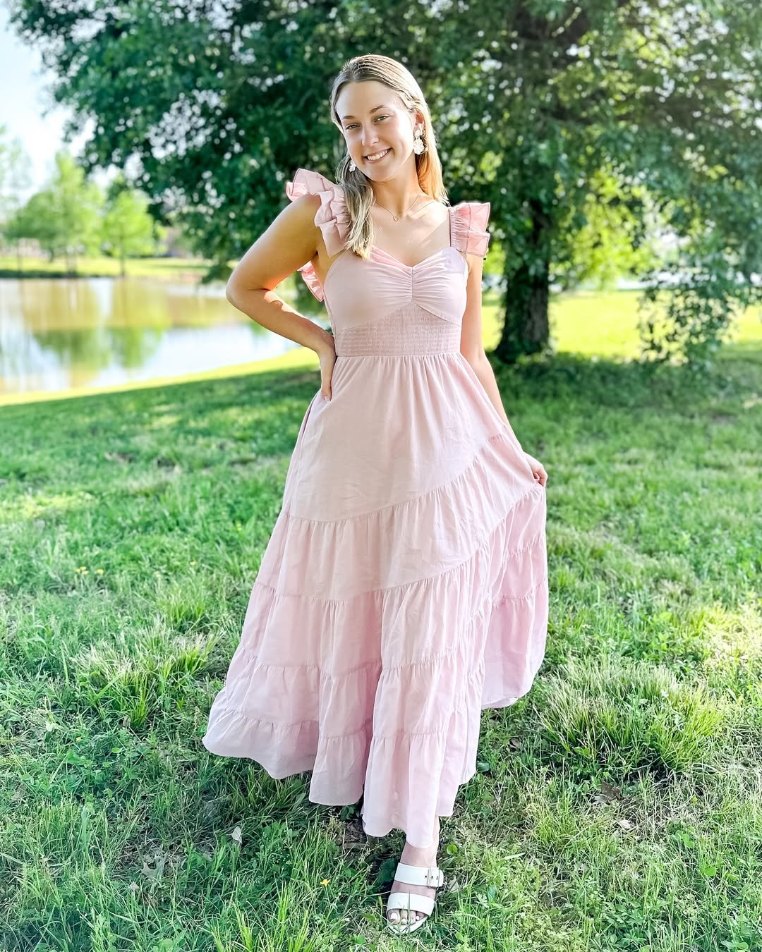This tiered pink maxi feels like a breath of fresh air. The ruffled straps and cinched waist keep it delicate and flattering, while the flowy skirt gives you that subtle twirl factor (and yes, you will twirl).