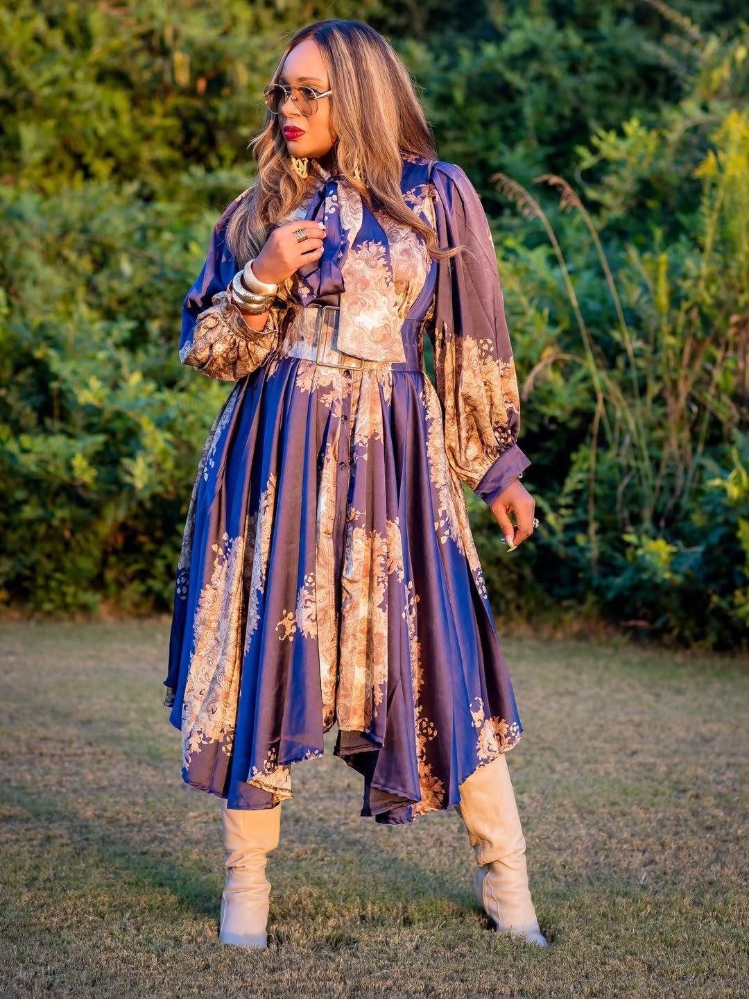 That belted, flowy dress with dramatic sleeves is a whole spring moment. The cinched waist balances the volume perfectly, creating that hourglass silhouette without sacrificing comfort.