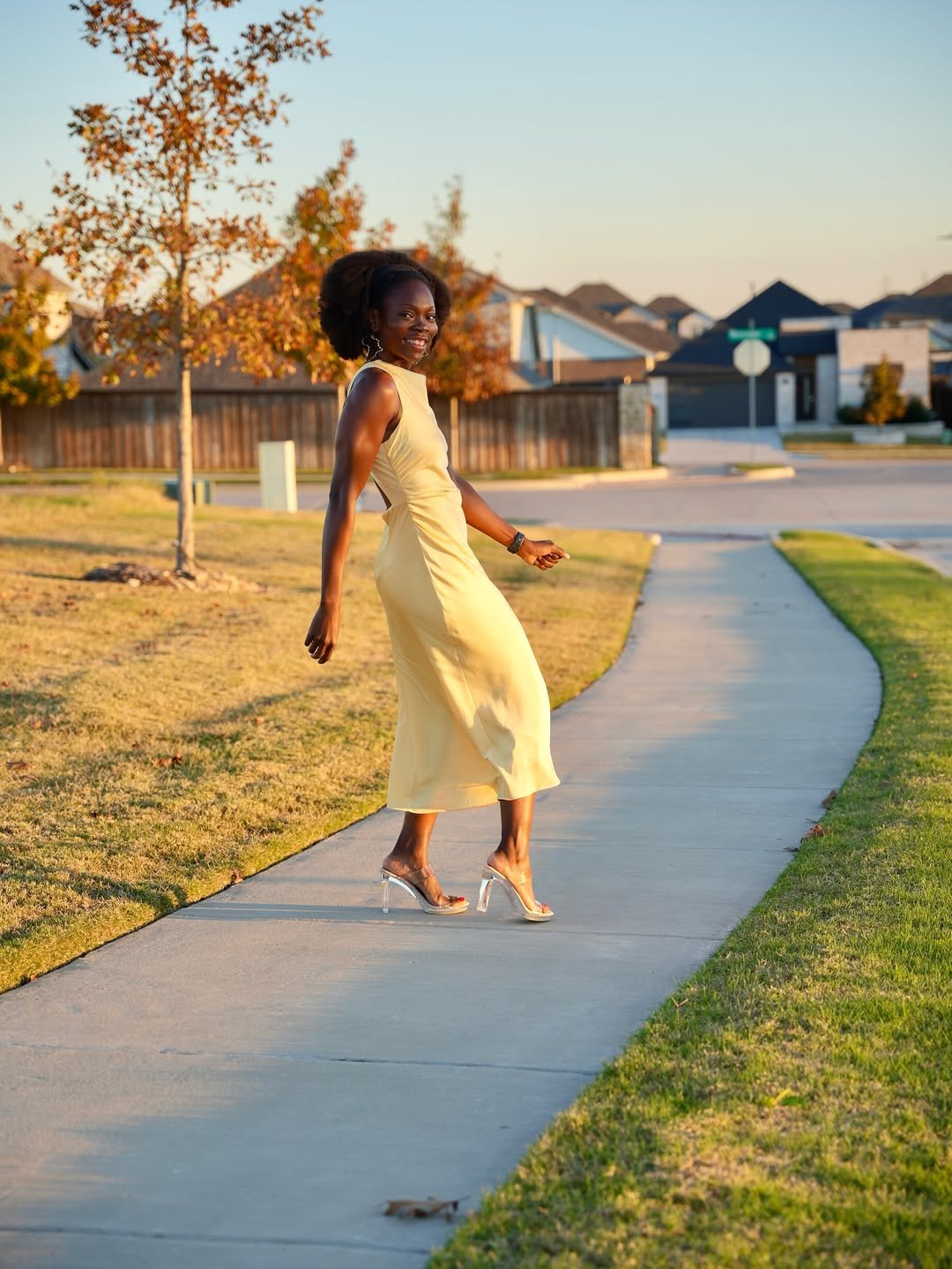 That buttery yellow midi in golden hour light? Pure mood booster. The clean silhouette keeps it classy, while the soft color feels optimistic and fresh—like the season itself.