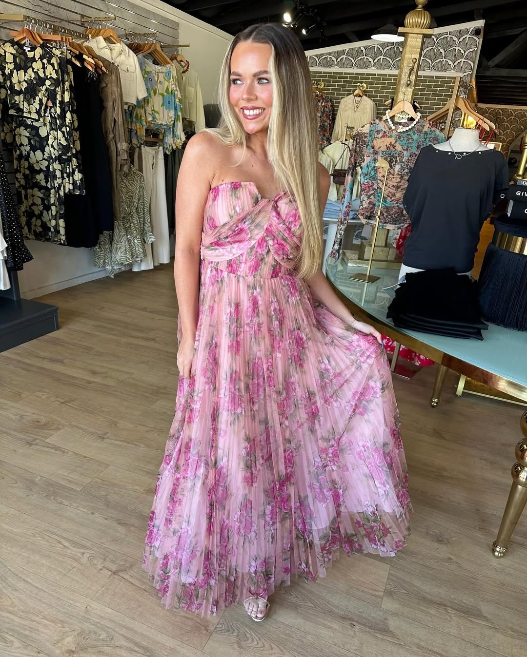This blush floral tulle dress is pure main character energy. The strapless neckline and flowing pleats feel whimsical, but the tailored bodice keeps it elevated.