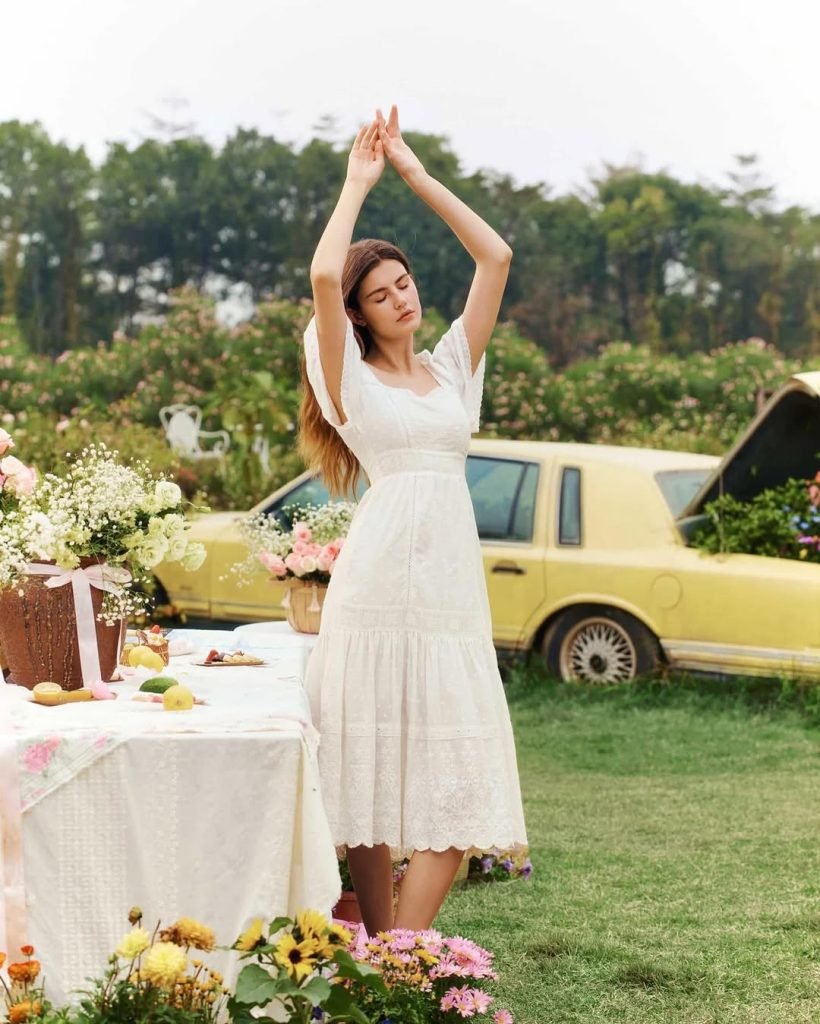 A soft white lace midi set against florals and an old-school yellow car feels like spring nostalgia done right. The flutter sleeves and tiered hem give it that heirloom energy, like something you’d pass down with a handwritten recipe tucked in the pocket.