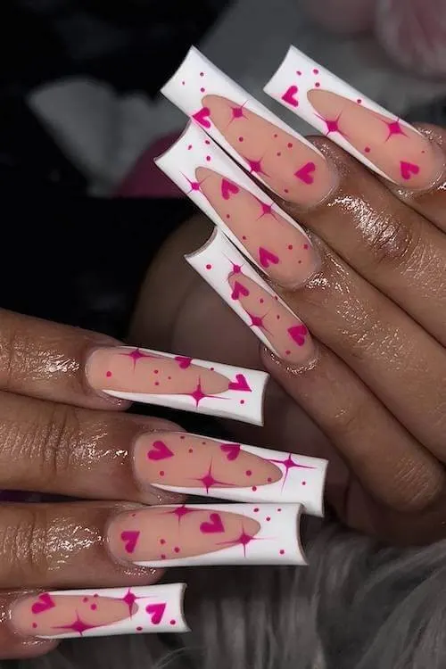 7. Bold White French + Hot Pink Hearts