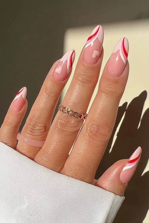 These nails bring a glossy swirl of pink and red, mixed with airy whites and hidden heart accents. The lines feel painterly and soft, almost like someone swirled strawberry cream into fresh milk.