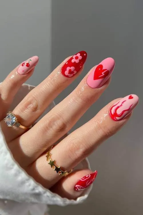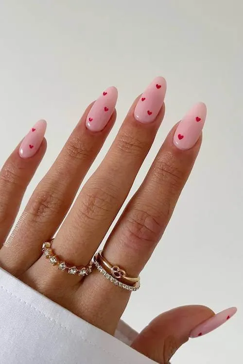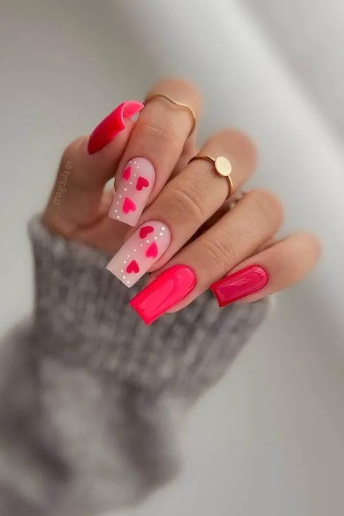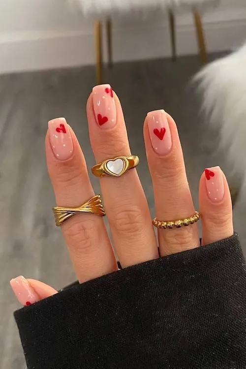 A soft neutral base becomes the perfect canvas for a sprinkle of red and pink hearts. Everything is placed just so, giving the look a scattered-confetti vibe that feels joyful and celebratory.