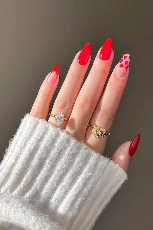Red French tips always hit different, but this glossy, lacquered red takes it to a whole new level. Paired with a single accent nail full of cascading hearts, the whole look feels both classic and flirtatious.