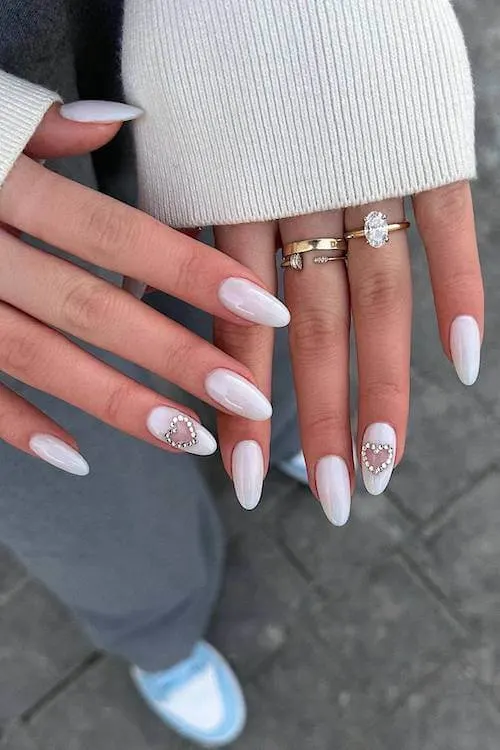 These soft, pearly white nails feel like winter sunlight—cool, glowy, and impossibly elegant. The tiny rhinestone heart frames add just enough sparkle to catch the eye without overwhelming the calm, milky base.