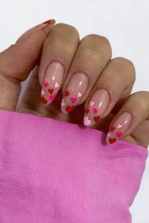 Tiny red and pink hearts drift across these sheer, natural-looking nails like little flutters of affection. The single bold pink tip adds such a playful twist — like a wink you didn’t see coming.