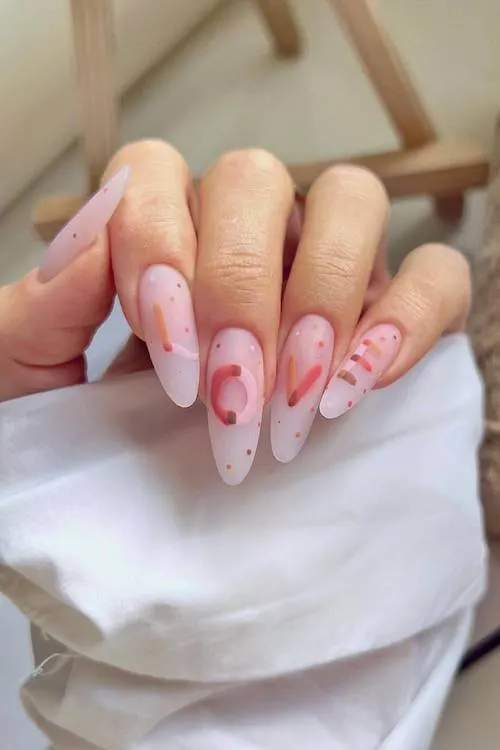 This charming matte set spells it out—literally. Each fingertip carries a soft pink whisper of a letter, forming “LOVE” across the hand. With tiny dotted accents and a velvety finish, it feels modern, soft, and a little artsy.