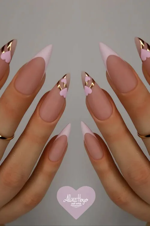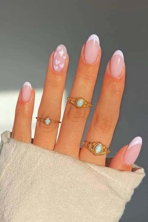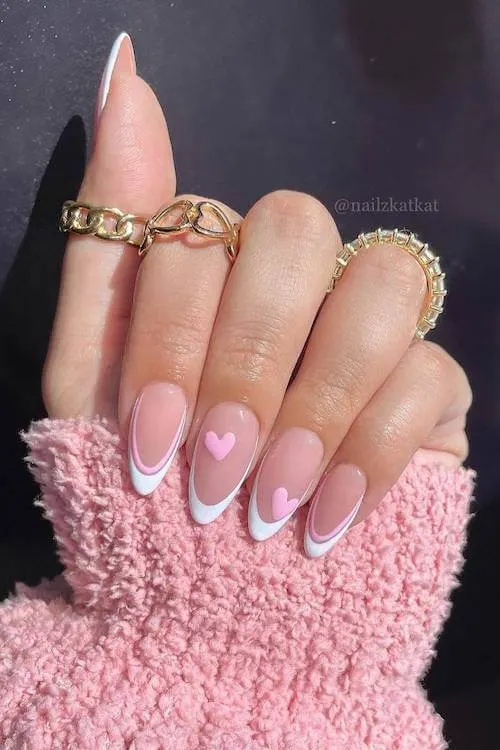 These soft white French swoops paired with little bubblegum-pink hearts feel like the clean-girl Valentine aesthetic everyone secretly wants. It’s sweet without being sugary, polished without trying too hard.